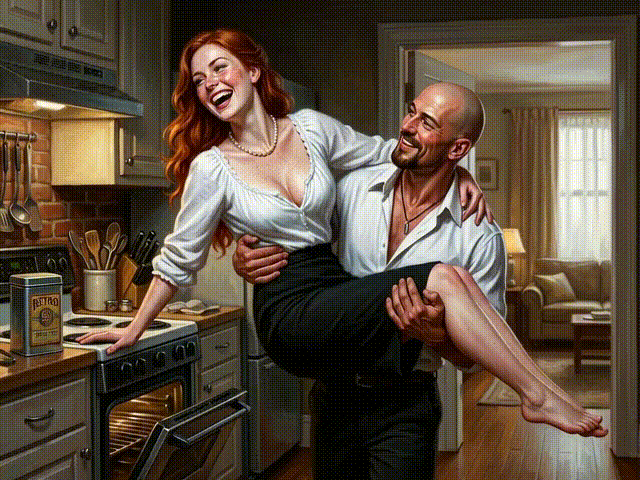 Half-dressed, we sampled the not-quite-ruined chicken at the counter. The glaze tasted better on us than on the bird. I dabbed paprika from her collarbone, faked a sneeze, and flicked flour onto her nose. She retaliated with a wet finger behind my ear… a guaranteed shiver. Seconds later we launched into a full-on tickle war, ribs and knees under siege until we collapsed against the fridge, wheezing.