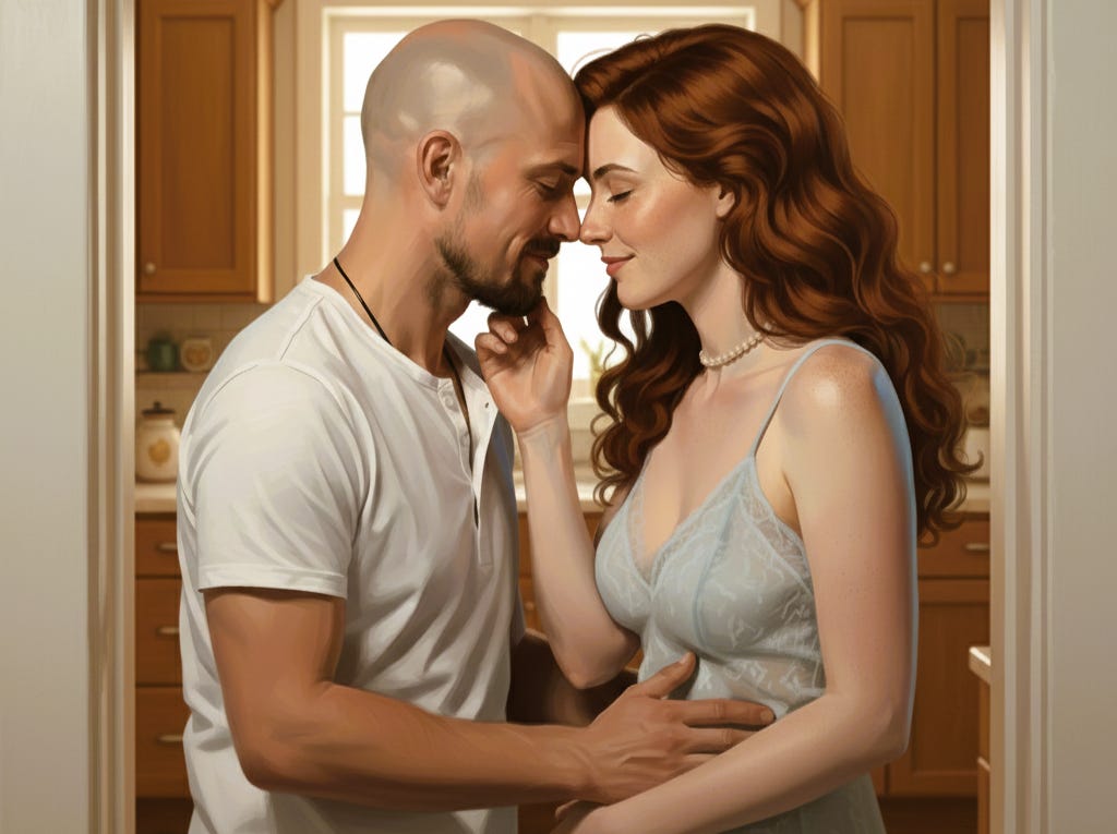 I hear her come down the stairs. That soft step I know better than my own breath. I turn from the counter, spatula in hand, and she’s already in the doorway. Powder blue nightgown. Pearl necklace catching the morning sun. Eyes soft. Barefoot.
