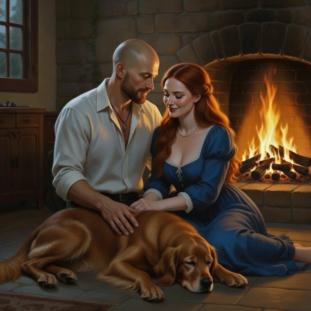 The fire cast its low amber light across the stone, and Rory, after a day spent collecting names, baths, grass stains, and emotional leverage, finally collapsed into proper sleep at our feet. Calder sat beside me with one hand resting on the dog’s back, and the whole room held that peculiar stillness that comes only after happiness has thoroughly worn itself out. No one was trying to prove anything anymore. The day had already done that for us.