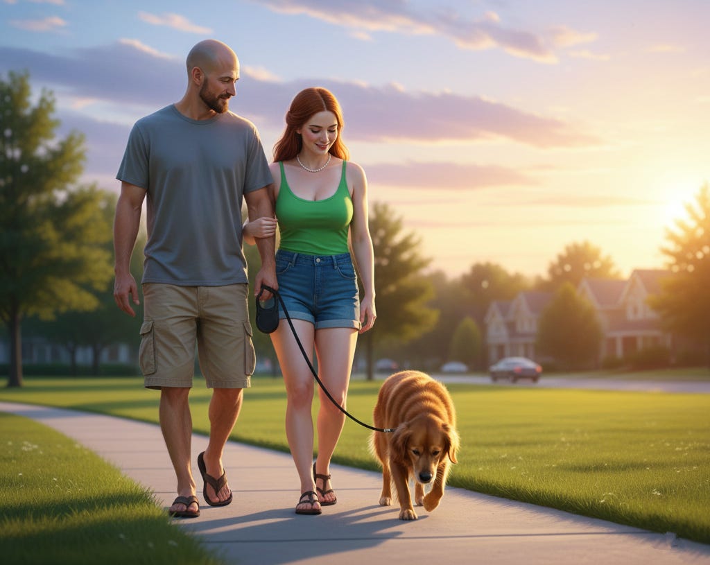 Rory lowered his head, sniffing with the seriousness of a detective at work, while we followed along behind him like two people who had already accepted that our household now operated according to golden-retriever law. And maybe that was the real charm of it: the quiet fact that this had already become one of our rituals. Walk the dog. Stay close. Let the day end gently.