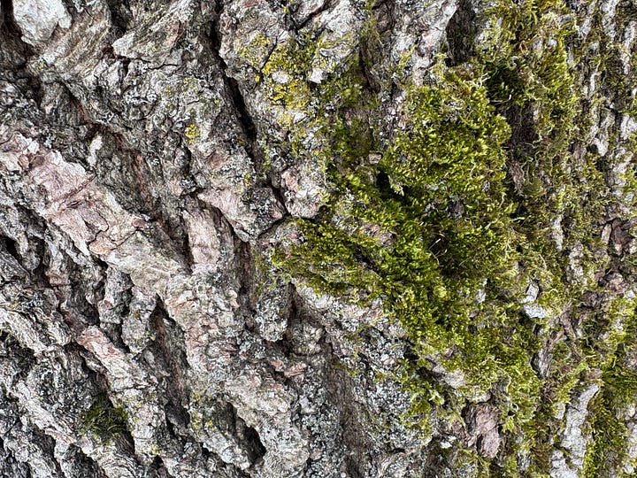 I park my van by this tree almost every single day, but never stopped to take a good look at it. This past week, I paused before going to work. Put my hand on the bark, felt the moss, paid close attention to how grounded I felt touching this tree. I got right up close and got the macro lens on my iPhone to kick in and got this beautiful shot.
