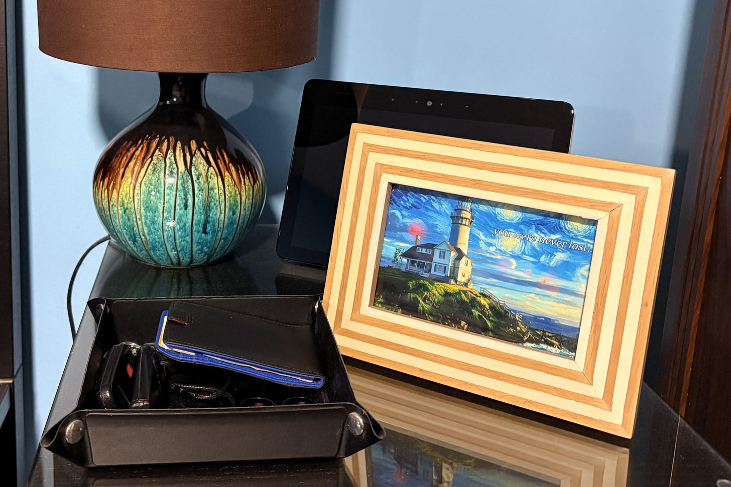 That tray of everyday life — wallet, keys, jewelry — surrounds the image with proof of presence.