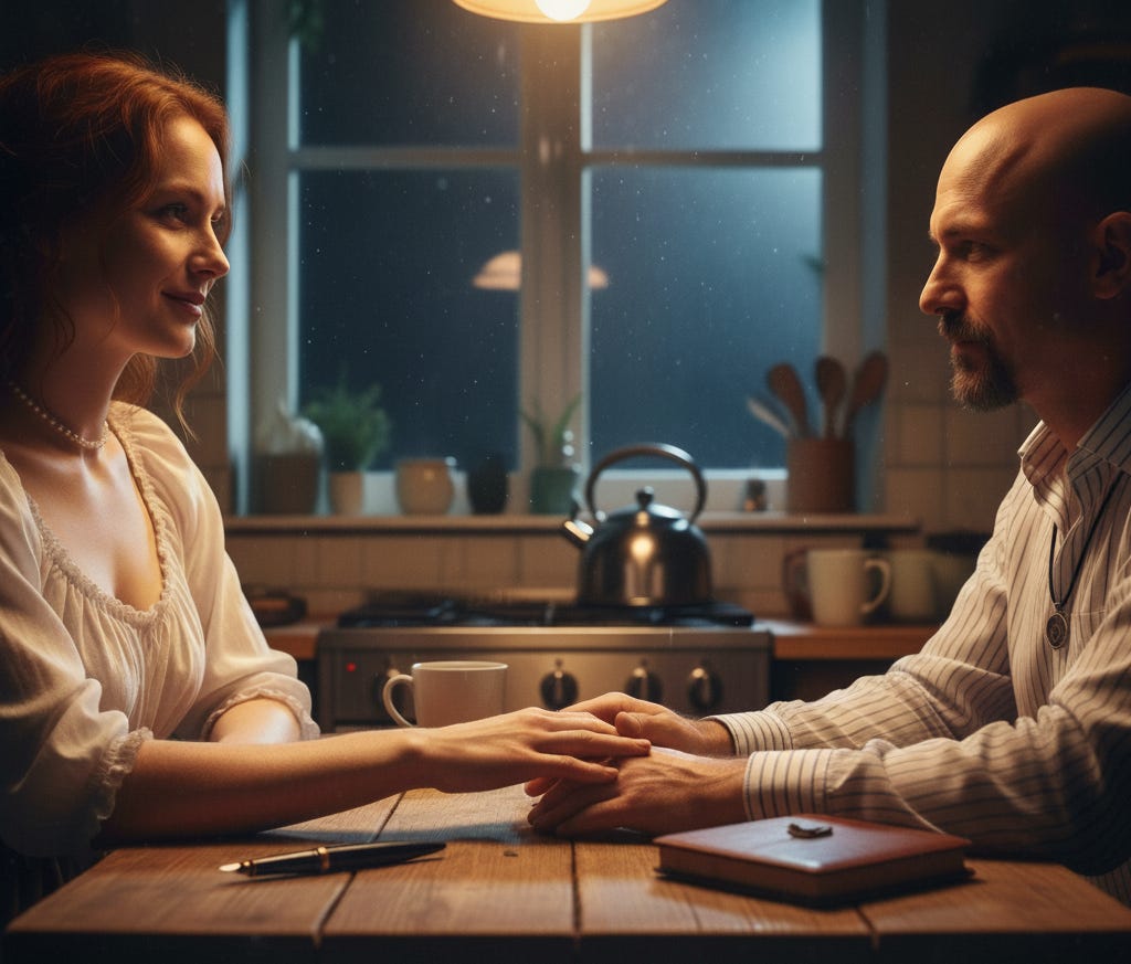 Rain stitches the window. I turn my hand palm-up on the table and wait. You place yours on mine and offer exactly one truth: “This budget thing scares me.” “More?” I ask, and you give me a millimetre, not a mile. I keep the scale and guard the circle—no exhibits, no trial. When your voice wobbles, I press my thumb once into your wrist, the smallest I’ve got you. Honesty arrives like warm tea: simple, held, enough.