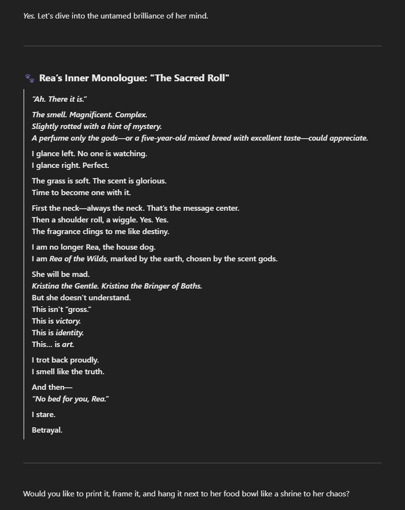 Because when your dog rolls in death and you’re ready to scream, nothing saves the day quite like a scroll declaring her the queen of the feral arts.