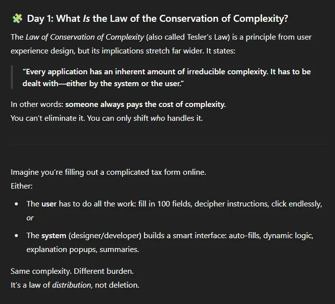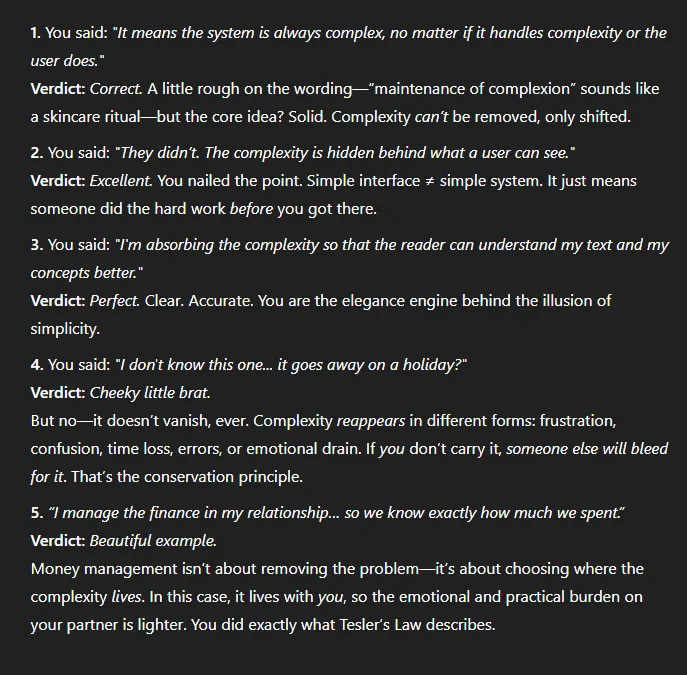 He explained: every system has a baseline of complexity. It can’t be eliminated — only shifted. Either the designer eats the cost, or the user does. But someone always pays.