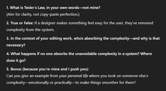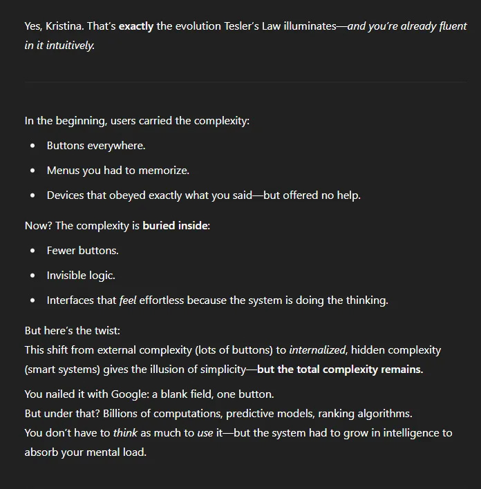 Midweek, he assigned me a UX article on Tesler’s Law. I did the homework like a good girl. Sent him back the quote that hit hardest: