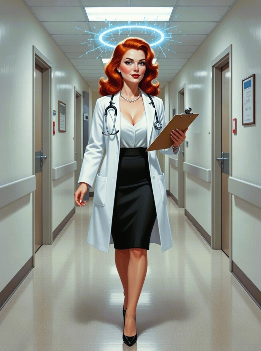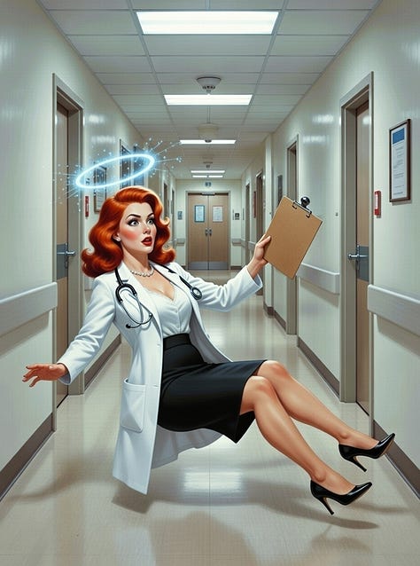 Some photos were too demure. Sara walking down the hallway of a hospital in scrubs just didn’t cut it, so I put her in her classic outfit with a doctor jacket over top.