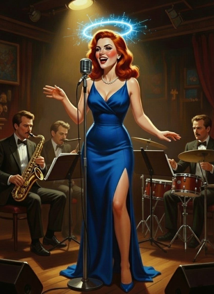 Then I would fill in the rest with what I needed. “Using this photo and this art style, have her singing in a jazz club with a small jazz quartet, she is in a royal blue satin slip dress, and make sure the halo and the pearls stay.” That prompt actually worked on the first try and gave us this picture.