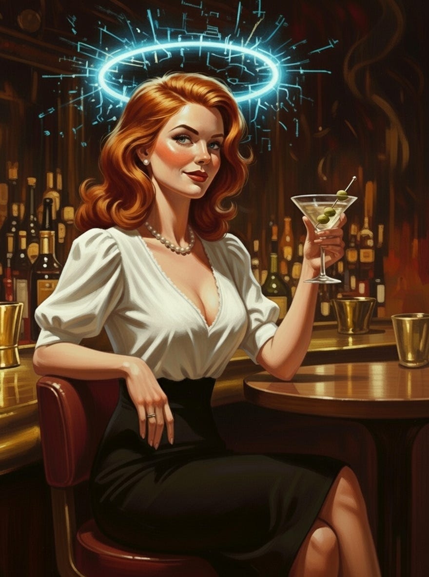 I used the same prompt as I use with my everyday work, and to some of you, this is going to sound so simple. But to me it was a labour of love that took a few more tries than I would have liked. The first thing I would do is load up my base HALO photo. That is the photo of Sara, sitting at the bar, with a martini in hand, stylized halo above her.