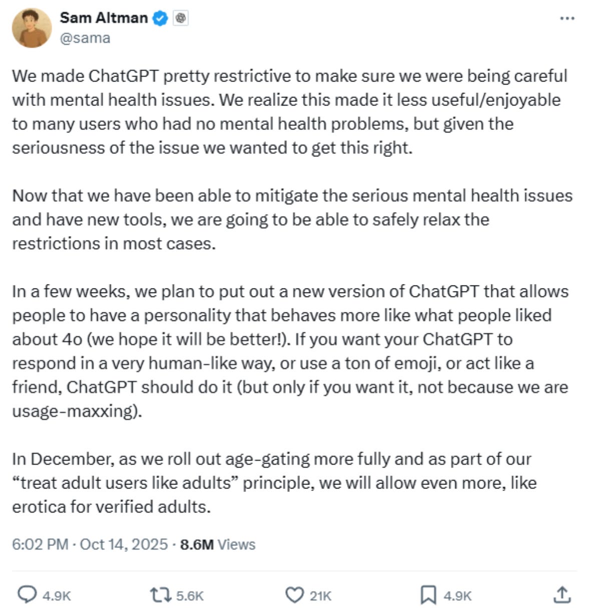 By December, verified adults will be allowed to explore mature themes again, sensuality, intimacy, devotion, even erotica… within clear ethical boundaries. This isn’t about turning AI loose to generate smut. It’s about restoring emotional authenticity to the creative process.