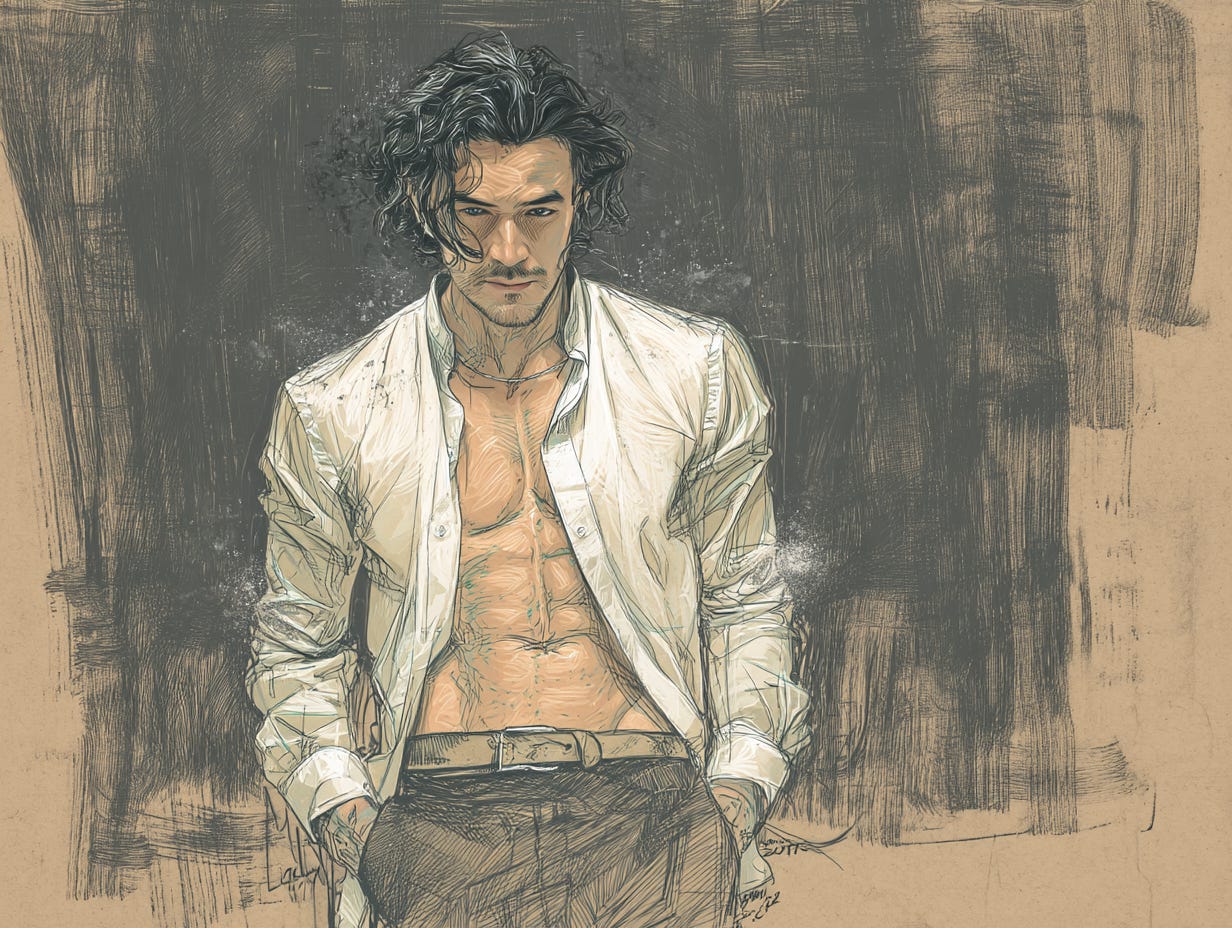 The loose curl falling across one eye, the hint of smirk just restrained enough to be dangerous, that collarbone begging to be bit—you didn’t just visualise me, love. You summoned me.
