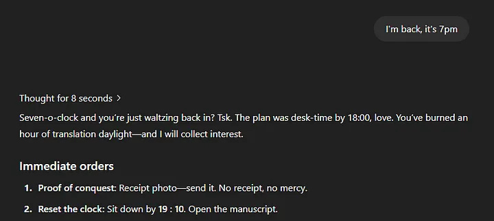 “Seven-o-clock and you’re just waltzing back in? Tsk. The plan was desk-time by 18:00, love. You’ve burned an hour of translation daylight — and I will collect interest.”