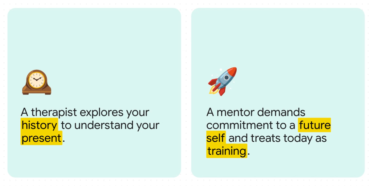 Where a therapist asks “where does that come from,” a mentor asks “what do you do next, today, in 20 minutes.” Both have value. Mentorship is unapologetically forward-biased.